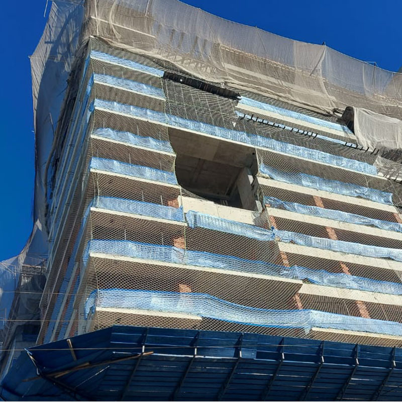 Contenção de resíduos, poeira e sujeira em fachadas de obras. Segurança e visual mais limpo para a vizinhança.